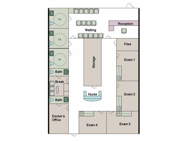 Sample floor layout for 1,800 square foot doctors office. Four 9,600 square foot Class A Professional Office Buildings. Each building is divisible into 1,200  square foot offices. Currently have letter of commitment from Silver Oaks Urgent Care for 4,800 square foot Urgent Care. Negotiating with Lab, X-Ray, and Pharmacy.